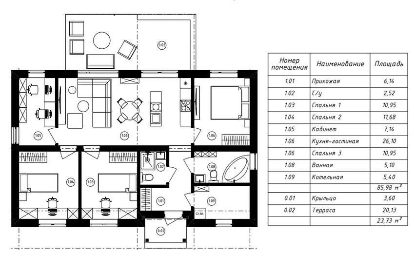 - кухню-гостиную 26,1м² с панорамным остеклением и выходом на террасу