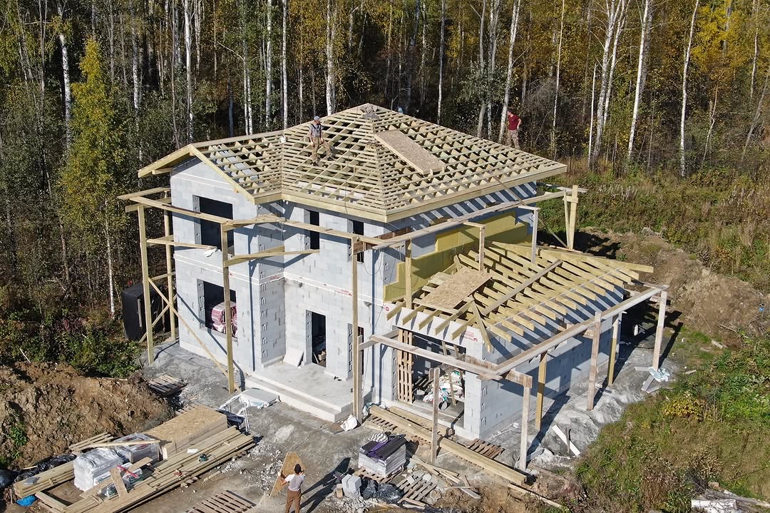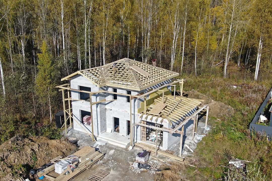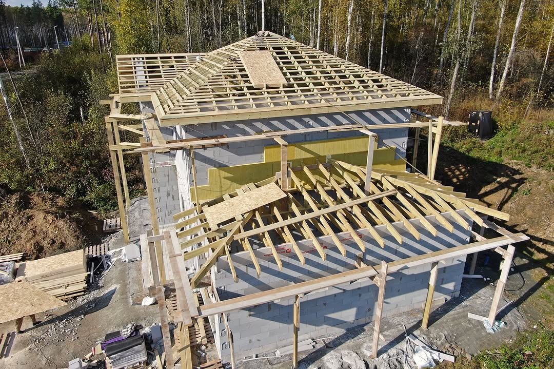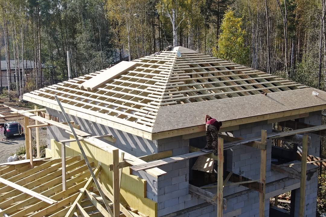 Монтируем кровлю двухэтажного дома 178м² с гаражом по проекту Резиденция в Первоуральском ГО, с. Новоалексеевское: спешим положить ОСБ и успеть закрыть его подкладочным ковром до наступления дождливой погоды.