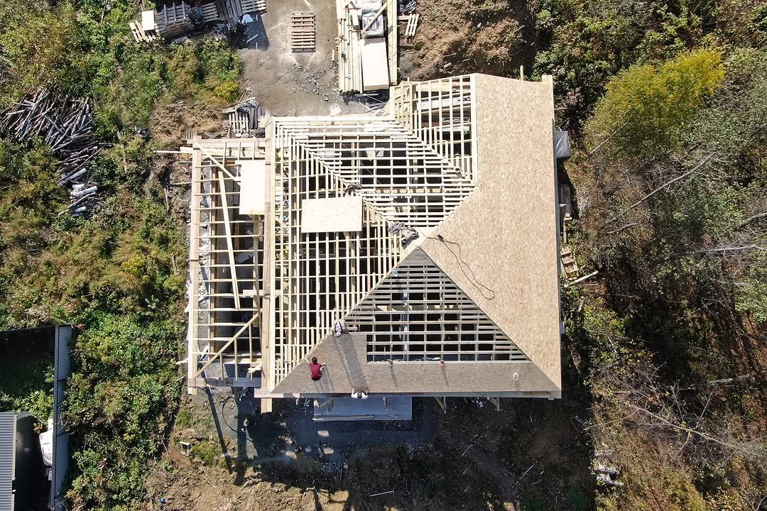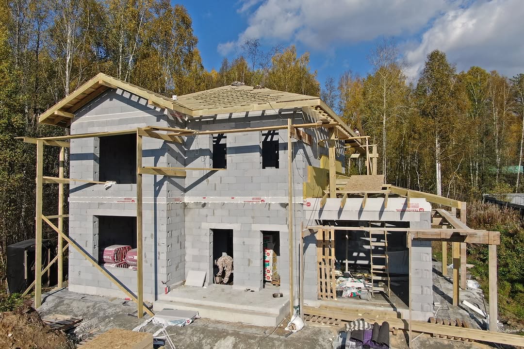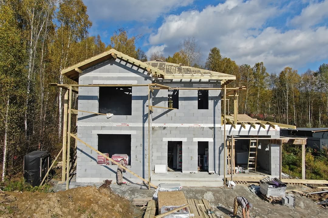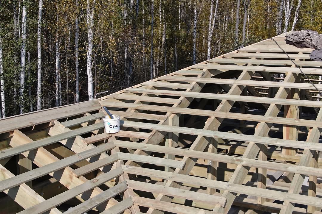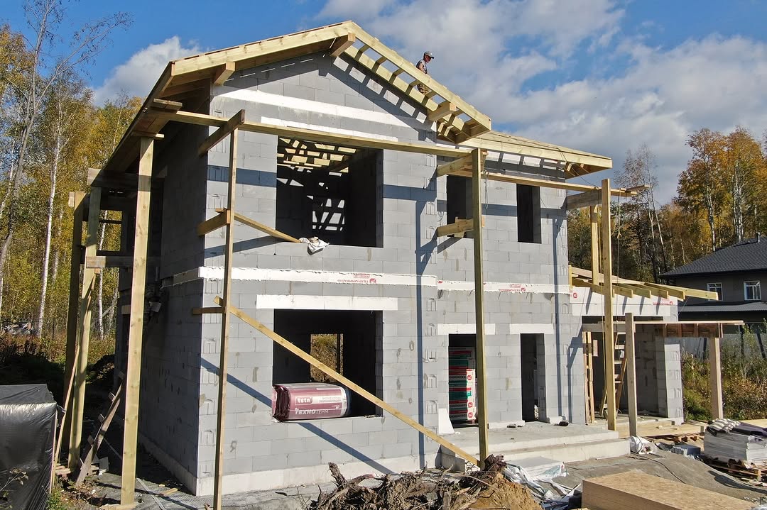 Монтируем кровлю двухэтажного дома 178м² с гаражом по проекту Резиденция в Первоуральском ГО, с. Новоалексеевское: спешим положить ОСБ и успеть закрыть его подкладочным ковром до наступления дождливой погоды.