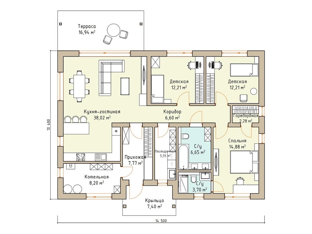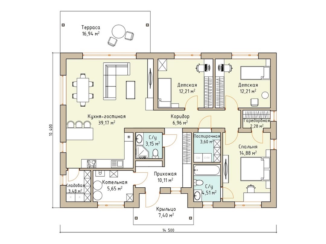 - Габариты дома - 10,4 на 14,5м