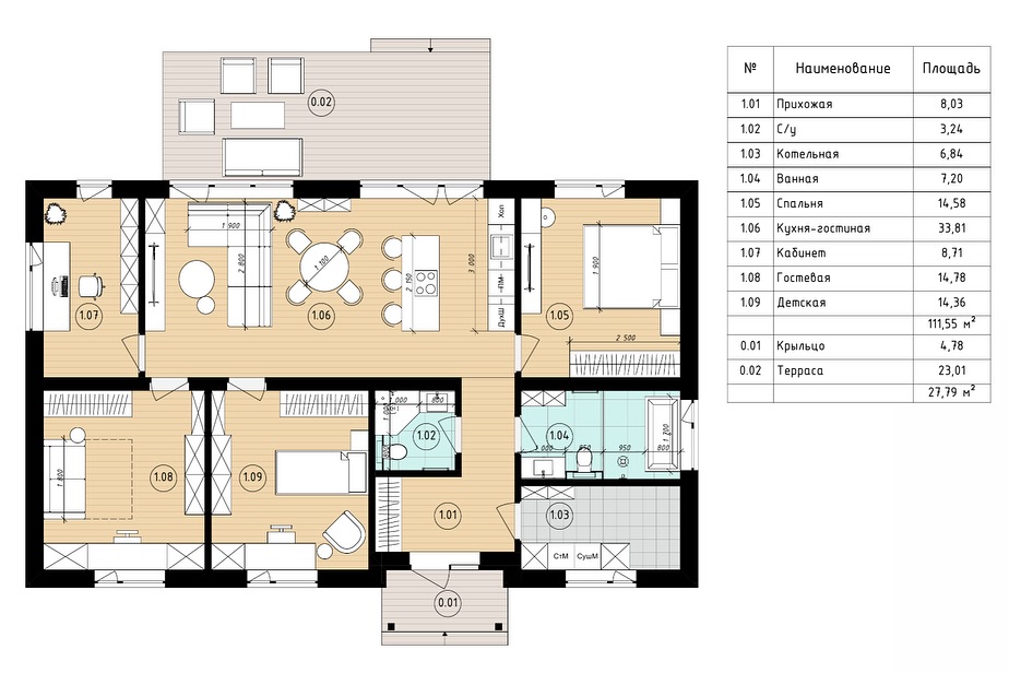 Строим одноэтажный дом в КП Заповедник, парк Ласточка по проекту Хвойный 115м2. Дом с кабинетом, тремя спальнями, двумя санузлами и панорамным видом на террасу из кухни-гостиной.