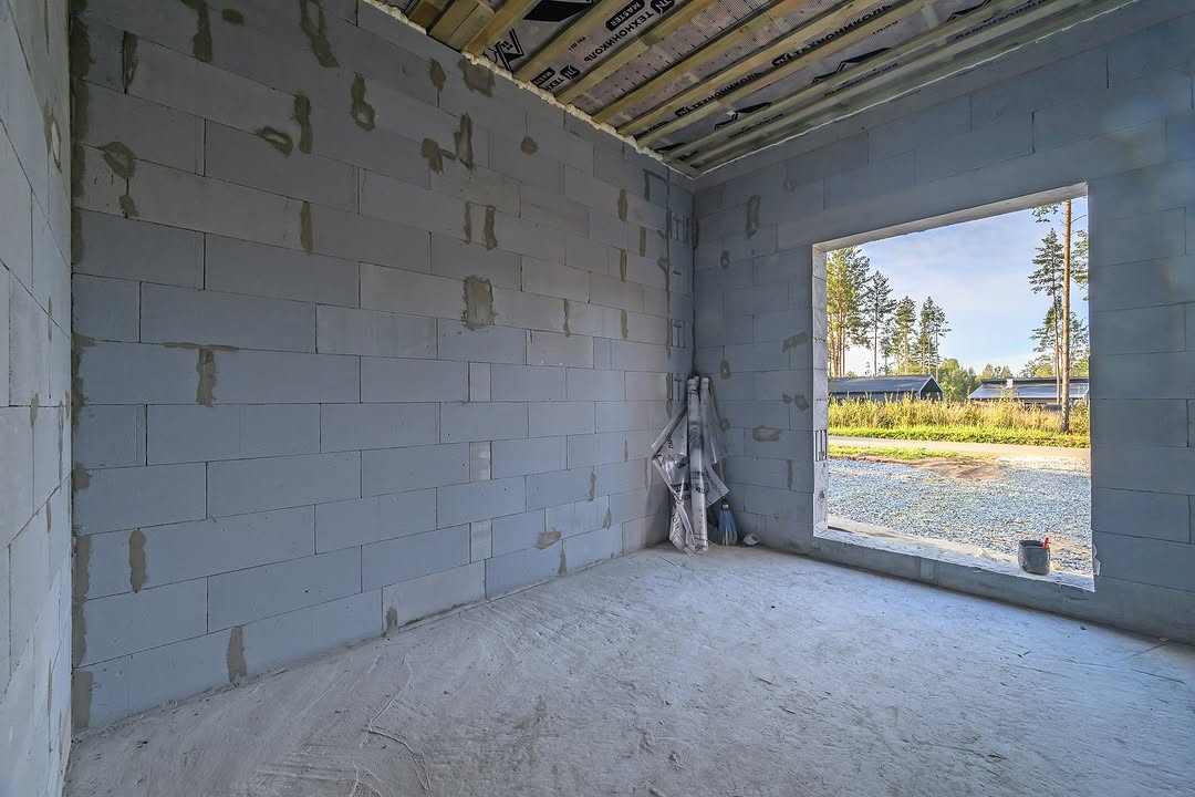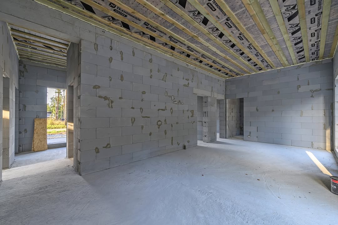 - Стены: наружные и внутренние несущие выполнены из газоблоков толщиной 30 см, плотностью D500