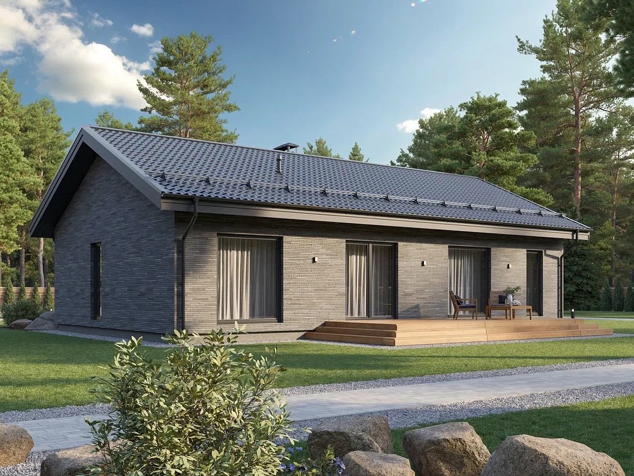 Типовой проект одноэтажного дома Хвойный 115м² с заметным, современным экстерьером: фасад из искусственного камня, панорамные окна, просторная терраса.