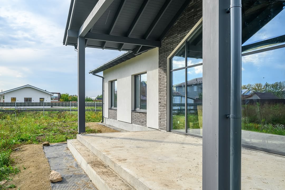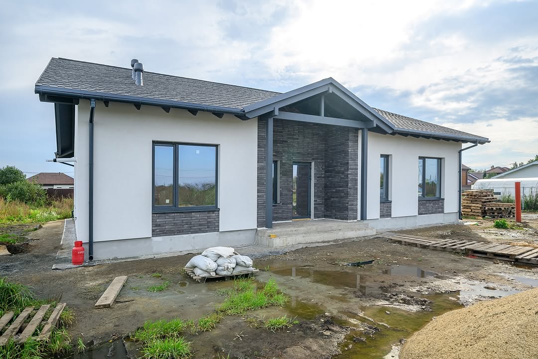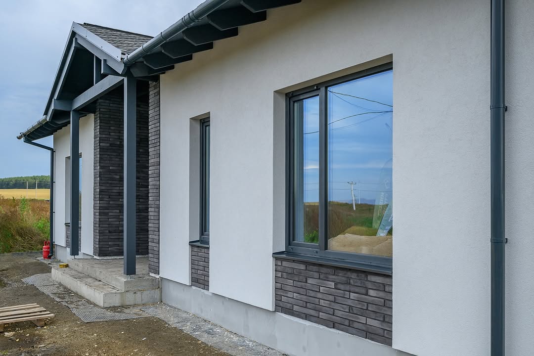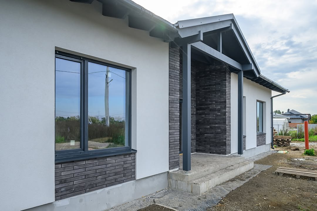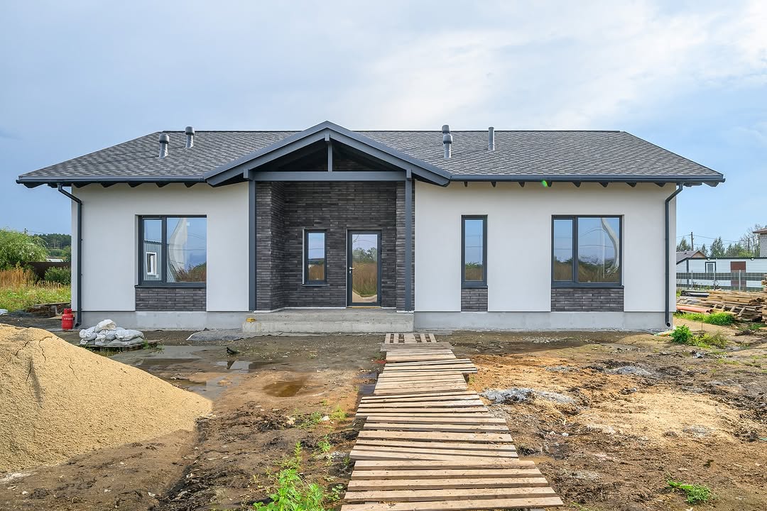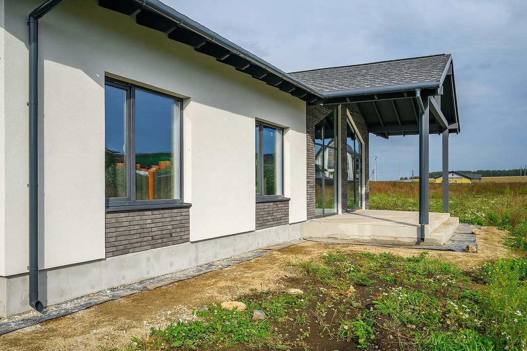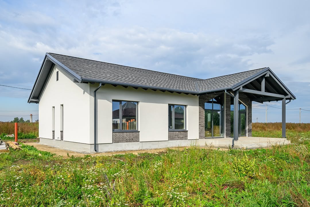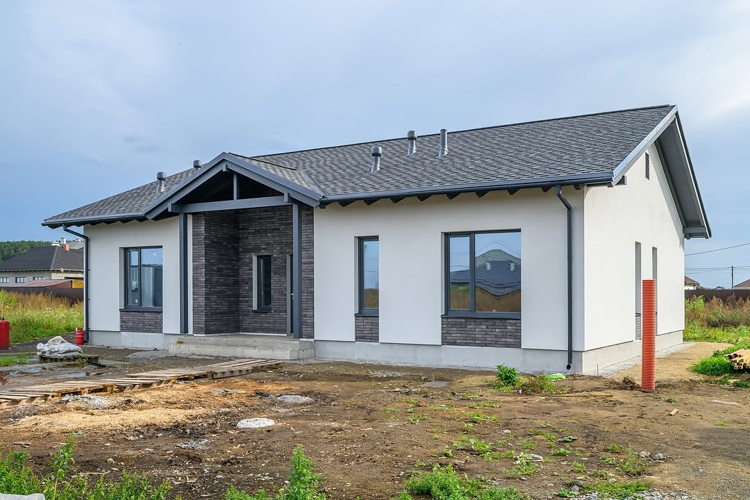 Завершили фасадные работы на одноэтажном доме 125м² по индивидуальному проекту в СНТ Новая Околица: утеплили стены базальтовой ватой 100 мм, отштукатурили фасад и отделали декоративными элементами из облицовочного камня Ригель Кирпич.