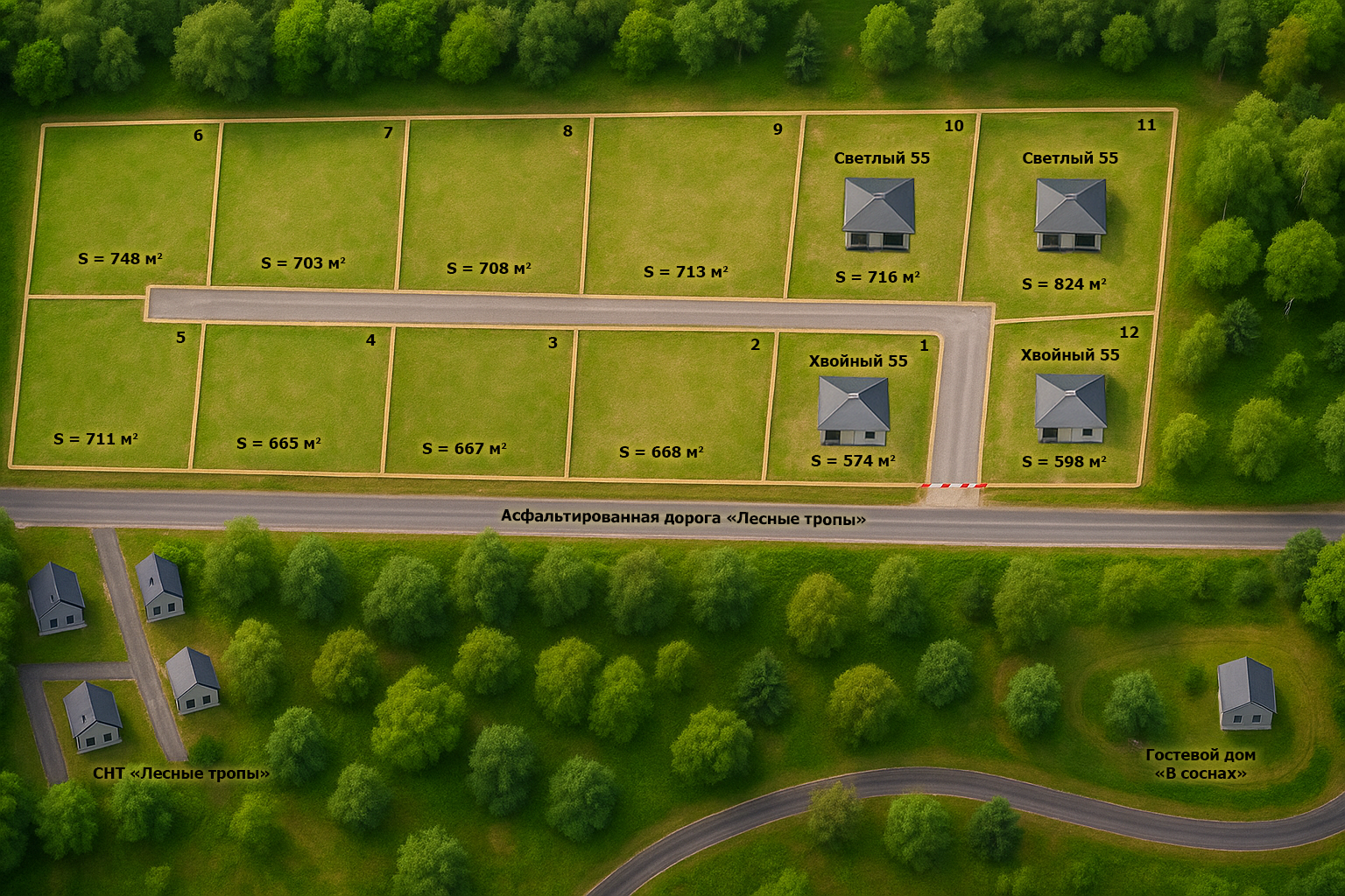 Въезд на территорию организован через шлагбаум. Каждый участок оснащен собственной въездной группой, что гарантирует приватность для жителей.